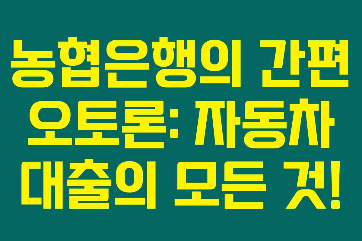 제가 직접 알아본 바로는, 농협은행의 간편 오토론은 자동차 구입 시 많은 도움이 되며, 특히 신차 구매를 원하는 분들에게 매우 유용한 상품이에요. 대출 조건이나 금리, 신청 방법 등에 대한 자세한 정보를 알고 싶다면, 아래를 읽어보시면 좋을 것 같아요.
