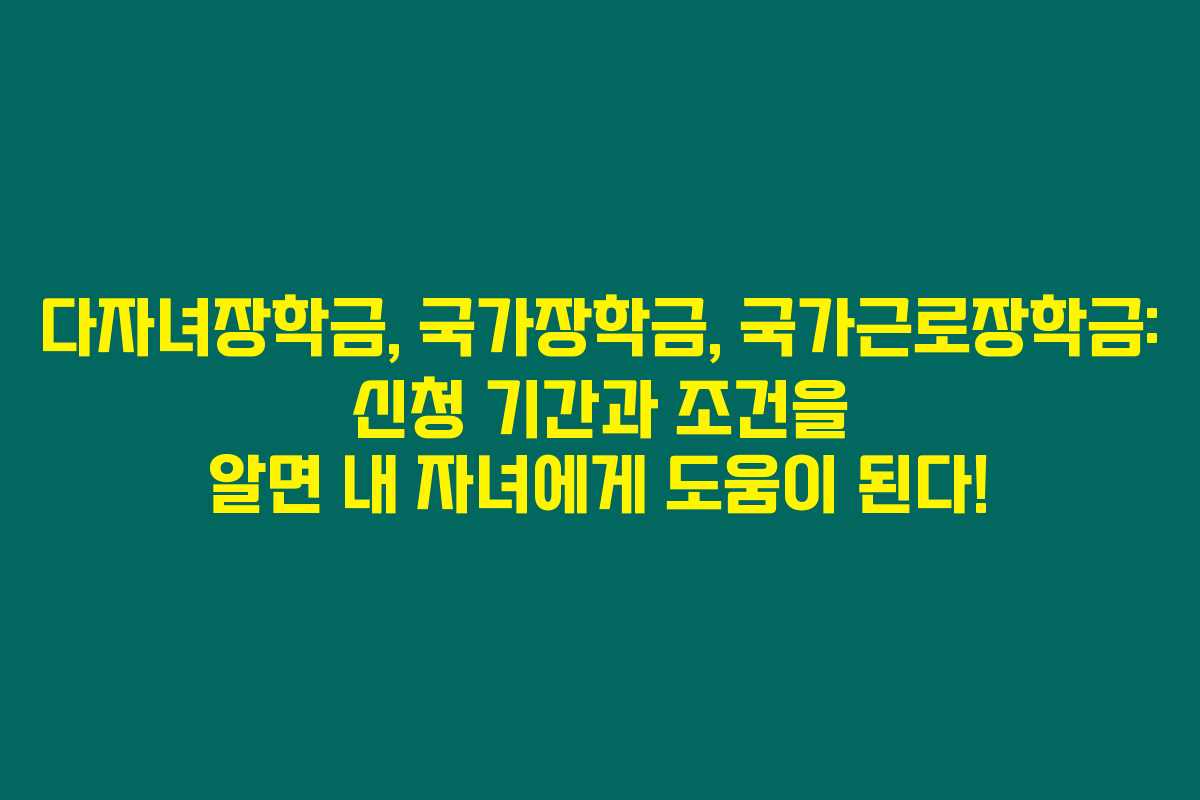 제가 직접 알아본 바로는, 대학생 자녀를 둔 가구는 물가 상승과 등록금 부담으로 큰 어려움을 겪고 있습니다. 그래서 다양한 장학 프로그램이 마련되어 있는데요. 다자녀장학금, 국가장학금, 국가근로장학금에 대해 신청 기간과 조건을 검토해 보도록 하겠습니다. 아래를 읽어보시면 이러한 장학금이 어떻게 도움이 되는지 확인할 수 있습니다.