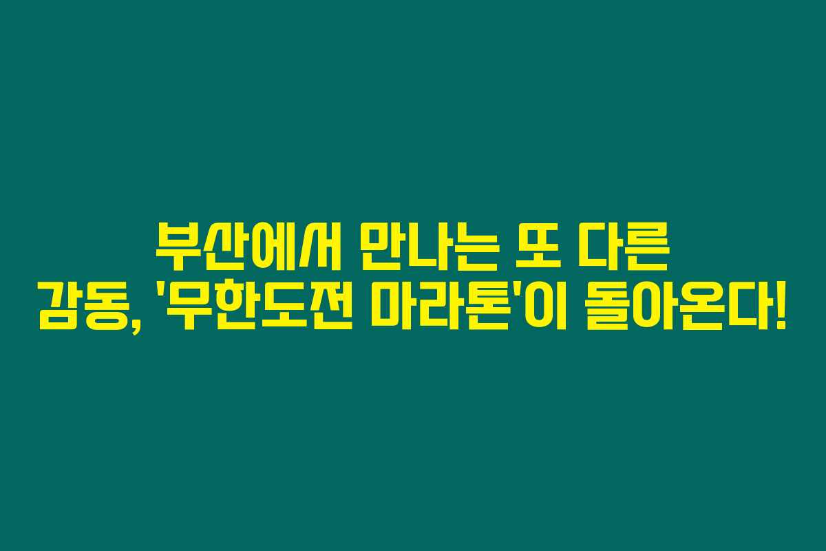 부산 무한도전 마라톤은 팬과의 특별한 소통을 기대케 하는 행사입니다. 미리 준비하여 올해의 최고의 순간을 놓치지 마세요.