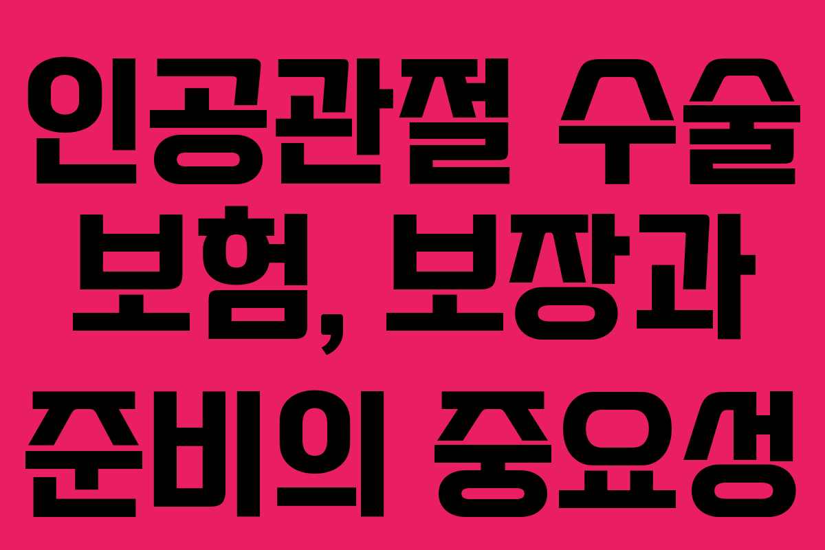 인공관절 수술은 많은 노인들에게 도움이 되는 치료법으로, 관절 통증을 완화하고 삶의 질을 높이는 데 기여합니다. 그러나 수술 비용이 상당하여 보험의 보장 여부가 매우 중요합니다. 보험에 가입할 때에는 여러 가지 기준과 조건을 확인해야 하며, 이를 통해 나중에 발생할 수 있는 문제를 예방할 수 있습니다. 본 글에서는 인공관절 수술 보험에 대한 주요 정보와 준비사항을 설명하겠습니다.